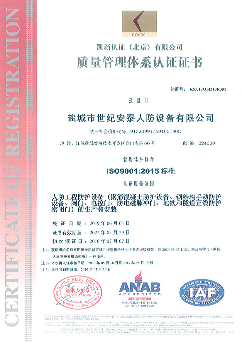 鹽城市世紀安泰人防設備有限公司是國家人民防空辦公室批準成立的人防工程防護設備定點生產和安裝企業,是專業生產、銷售、安裝人防防護設備產品的企業,公司主要生產鋼筋混凝土防護設備、鋼結構手動防護設備、閥門、電控門、防電磁脈沖門、地鐵和隧道正線防護密閉門等各類產品并對產品進行安裝、調試、維修及保養,公司生產的各種規格的人防工程產品,均按國家人防總參工程兵四所及中國建筑標準設計研究院提供的圖紙生產,符合各種人防工程設計要求,是各類地下人防工程選用的理想產品。本公司已通過GB/T19001-2008IDT ISO9001:2008國家質量體系認證。